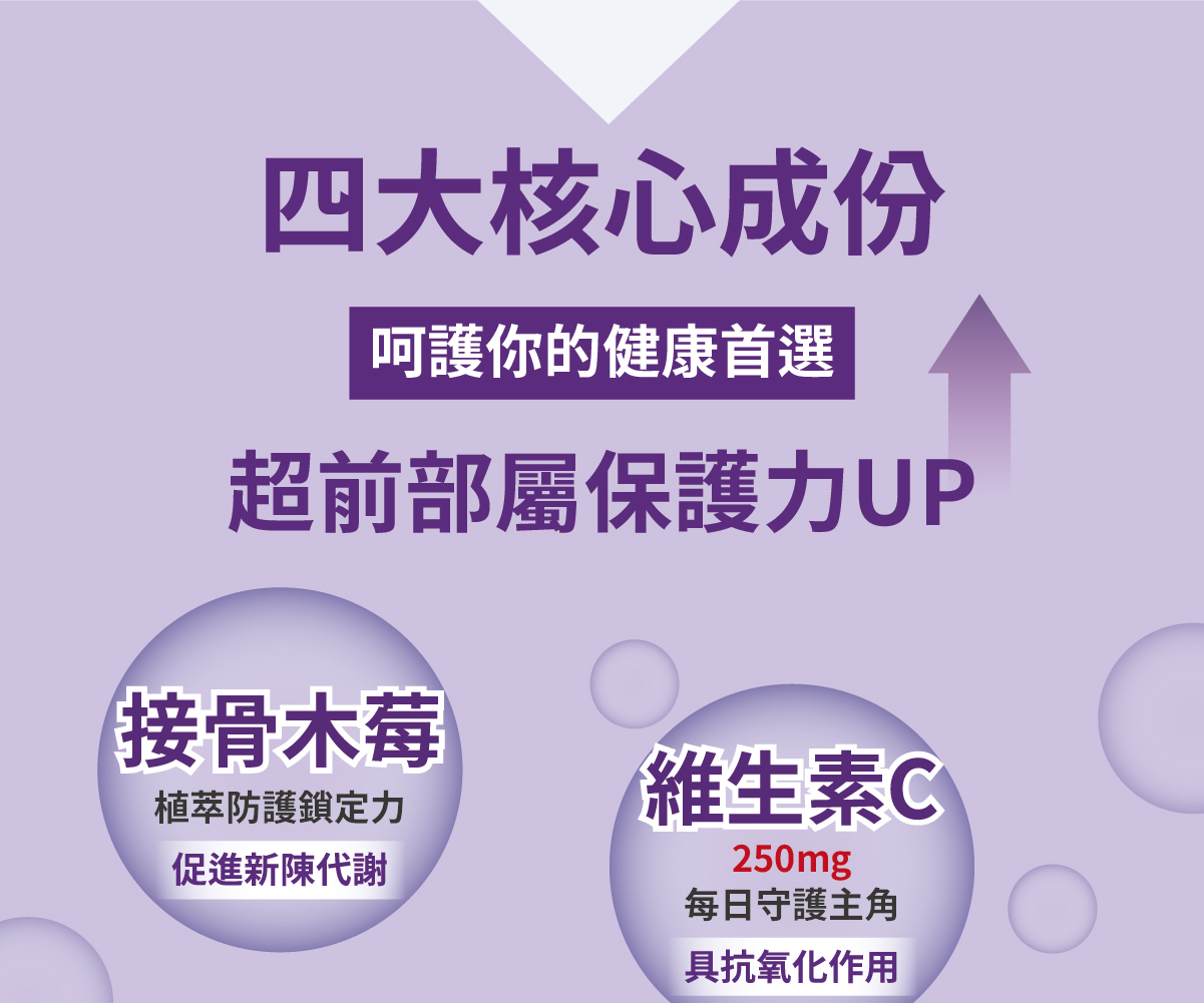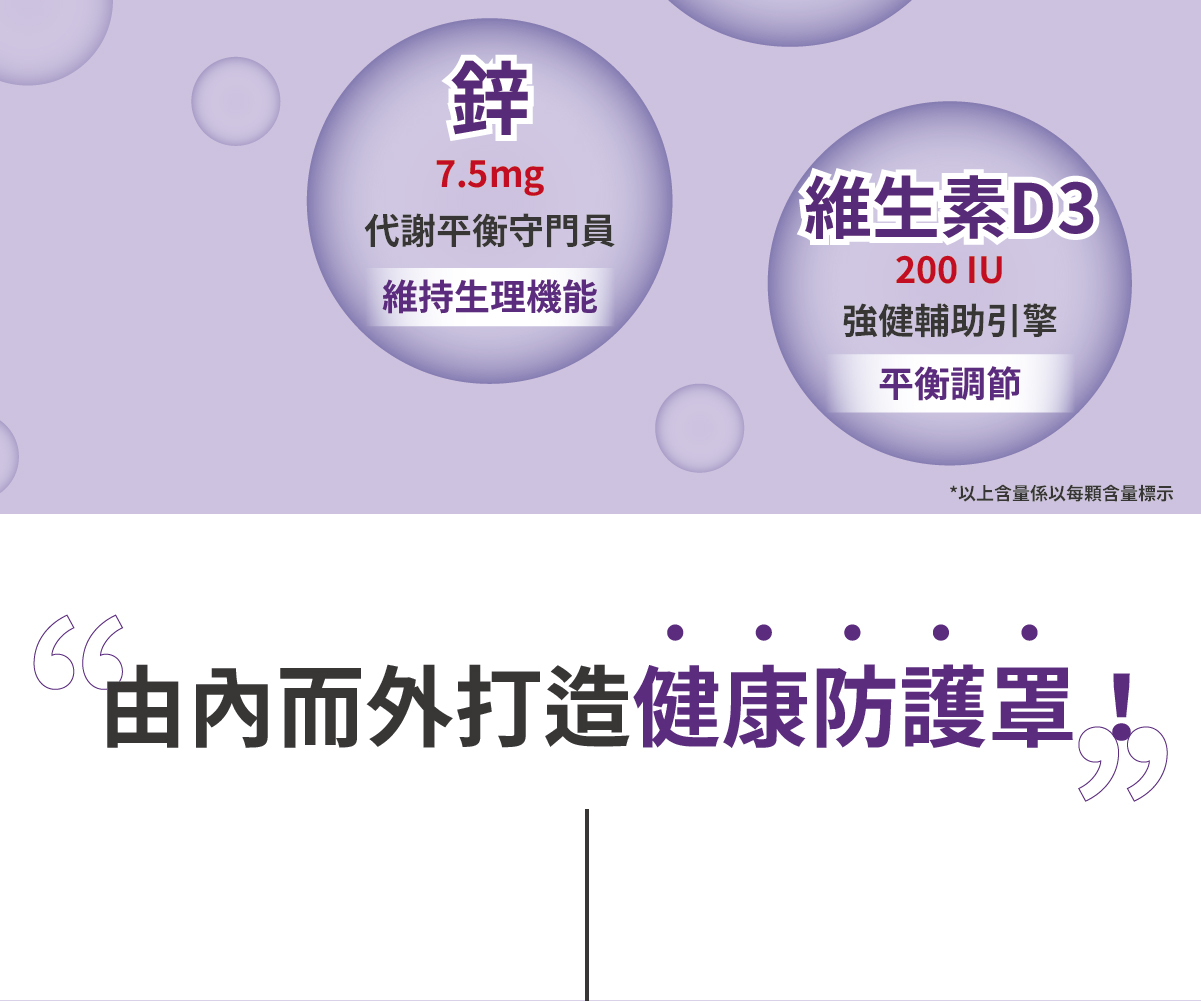 | 成分 | 抗壞血酸(維生素C)、微結晶狀α-纖維素、葡萄糖酸鋅、接骨木莓萃取物、硬脂酸鎂、維生素D3(辛烯基丁二酸鈉澱粉、蔗糖、抗壞血酸鈉(抗氧化劑)、中鏈三酸甘油酯、二氧化矽、生育醇(抗氧化劑)、維生素D3)。 膠囊:明膠、硫酸月桂酯鈉、食用紅色六號、純水、甘油、二氧化鈦、食用藍色一號。 |