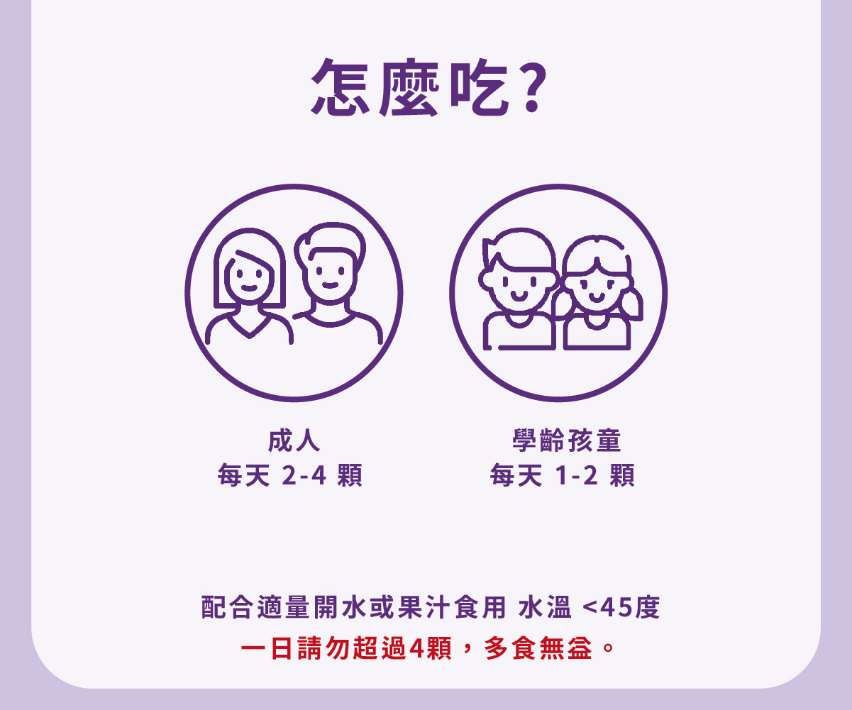 | 使用方法 | 每日1-2顆,配合適量開水或果汁食用(水溫<45℃)。 |